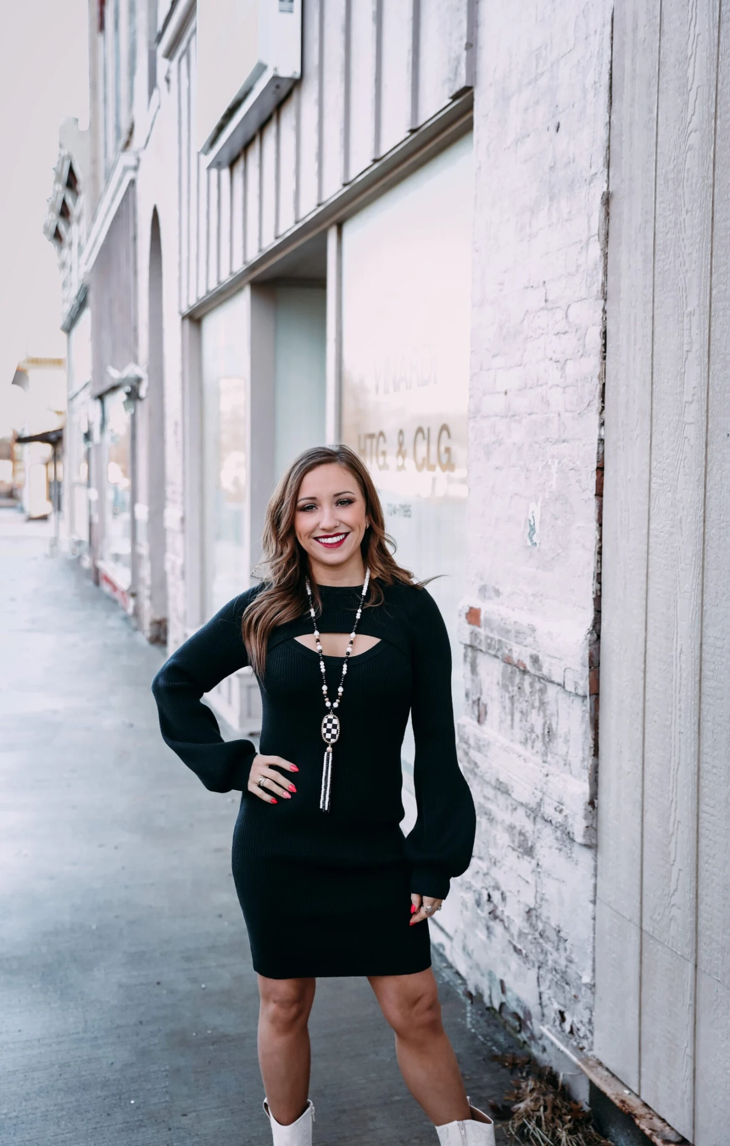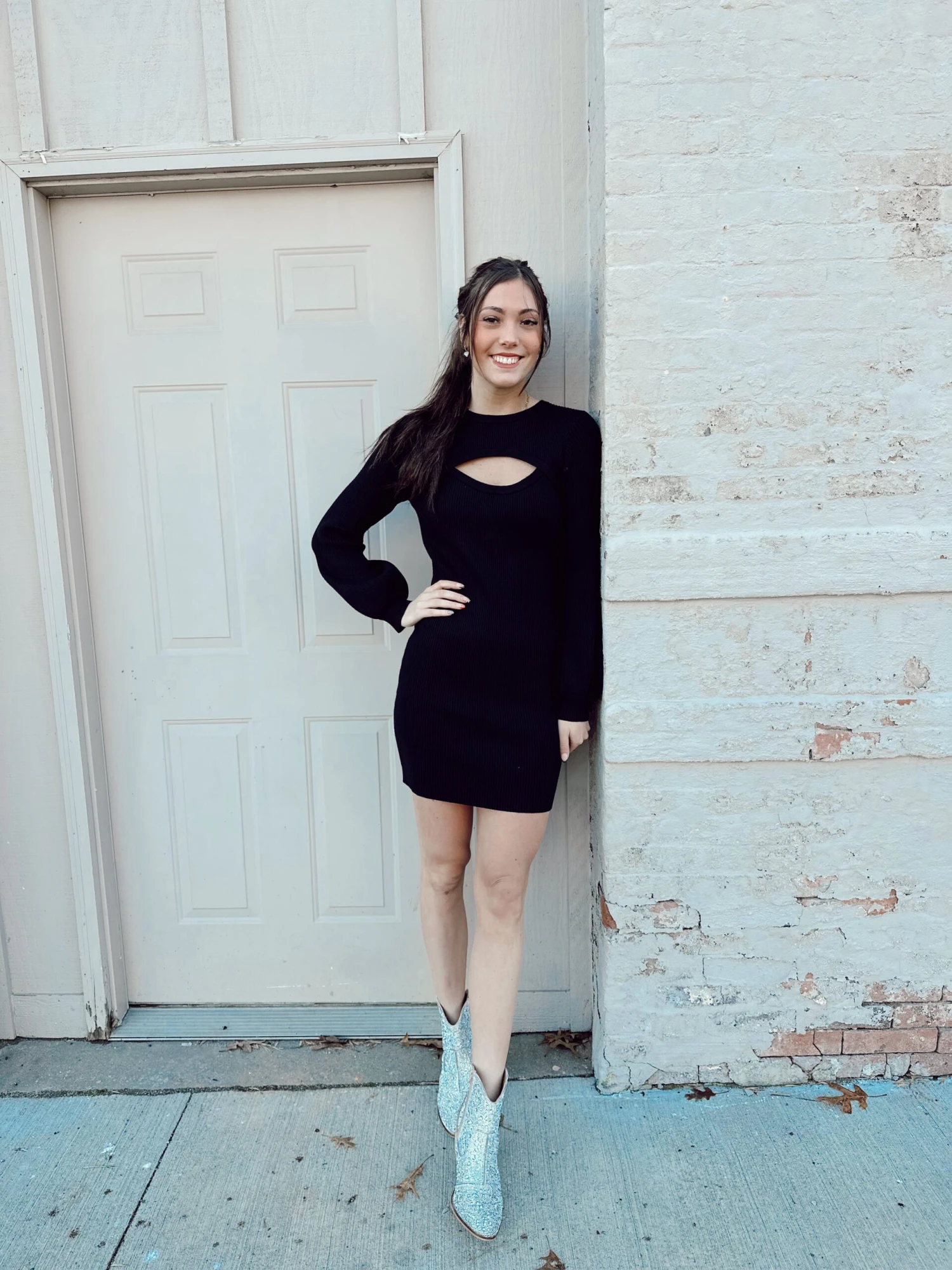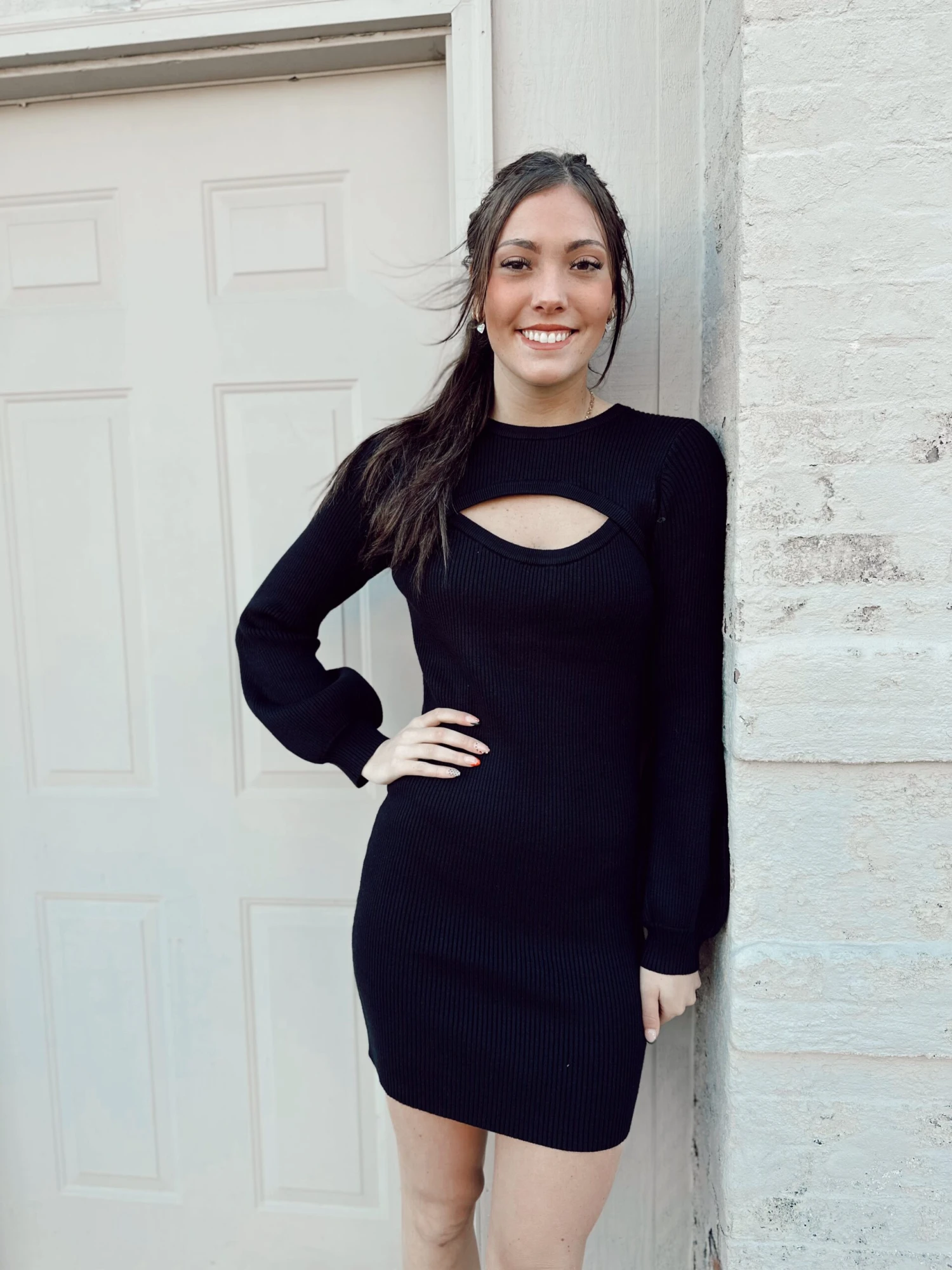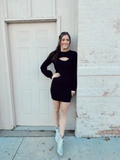 The cutest dress for all your work needs and holiday partys great to throw on any style of boot and the cut out adds the perfect touch to the fun dress!