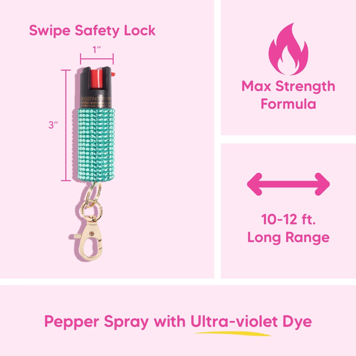 BLINGSTING Pepper Spray is compact, durable, lightweight and maximum self-defense power. With a swipe-safety lock to prevent misfires and a sturdy lobster clip that easily attaches to any keychain, purse, or bag – it’s sparkly cute like a purse charm! Non-lethal personal protection trusted by parents, gifted to women, and girls love to carry. Dad approved, but hey, this is not your dad’s pepper spray!