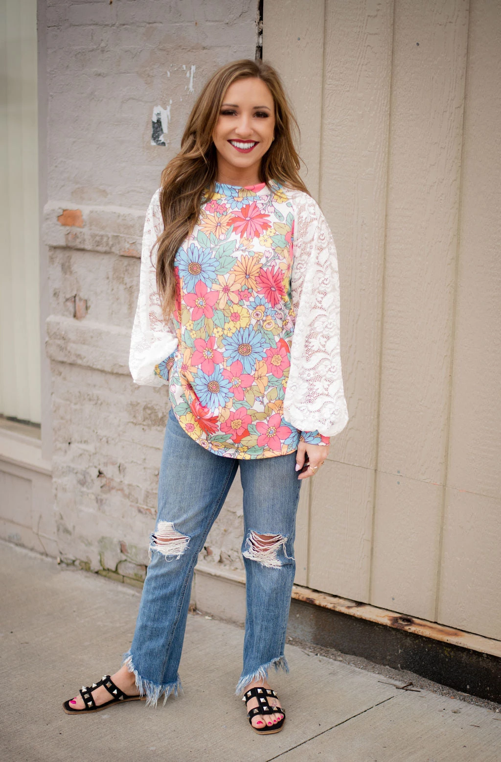 A floral top that has some fun cute lace detail and perfect for all things spring and summer with the bright colors!