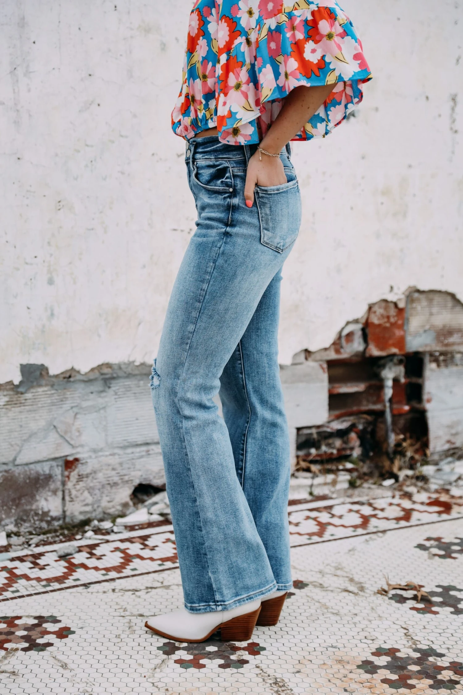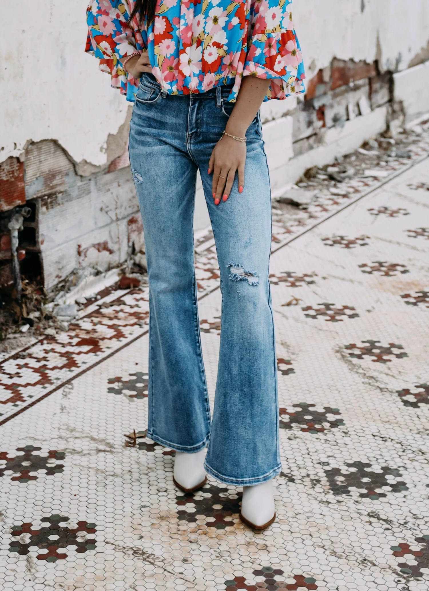 The perfect denim with some cute distressing and a cute flare super stretchy and so comfy!