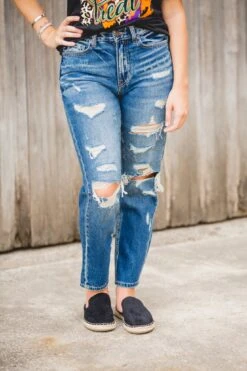The cutest mom fit denim! True to size in the waist and relaxed fit through the bottom!