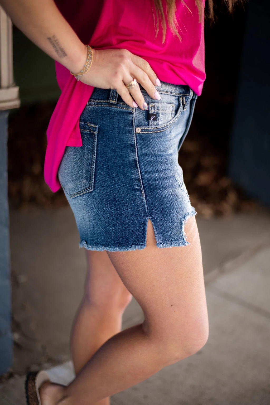 Short jean Dark stone wash Stretch Open side seam Frayed hem