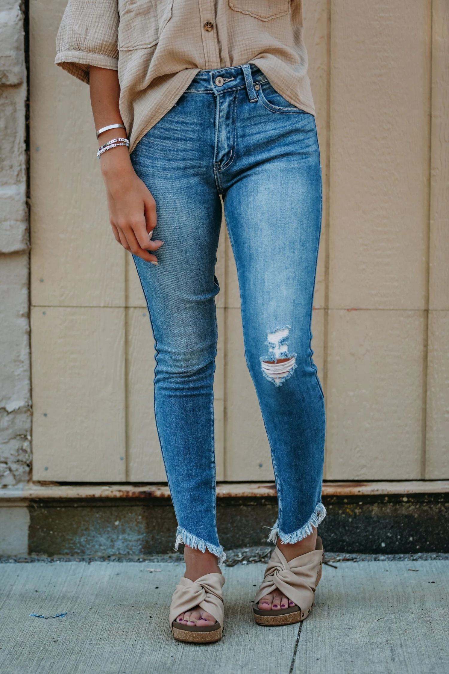 A perfect lightwash denim with no holes! A frayed bottom that adds more detail to it!