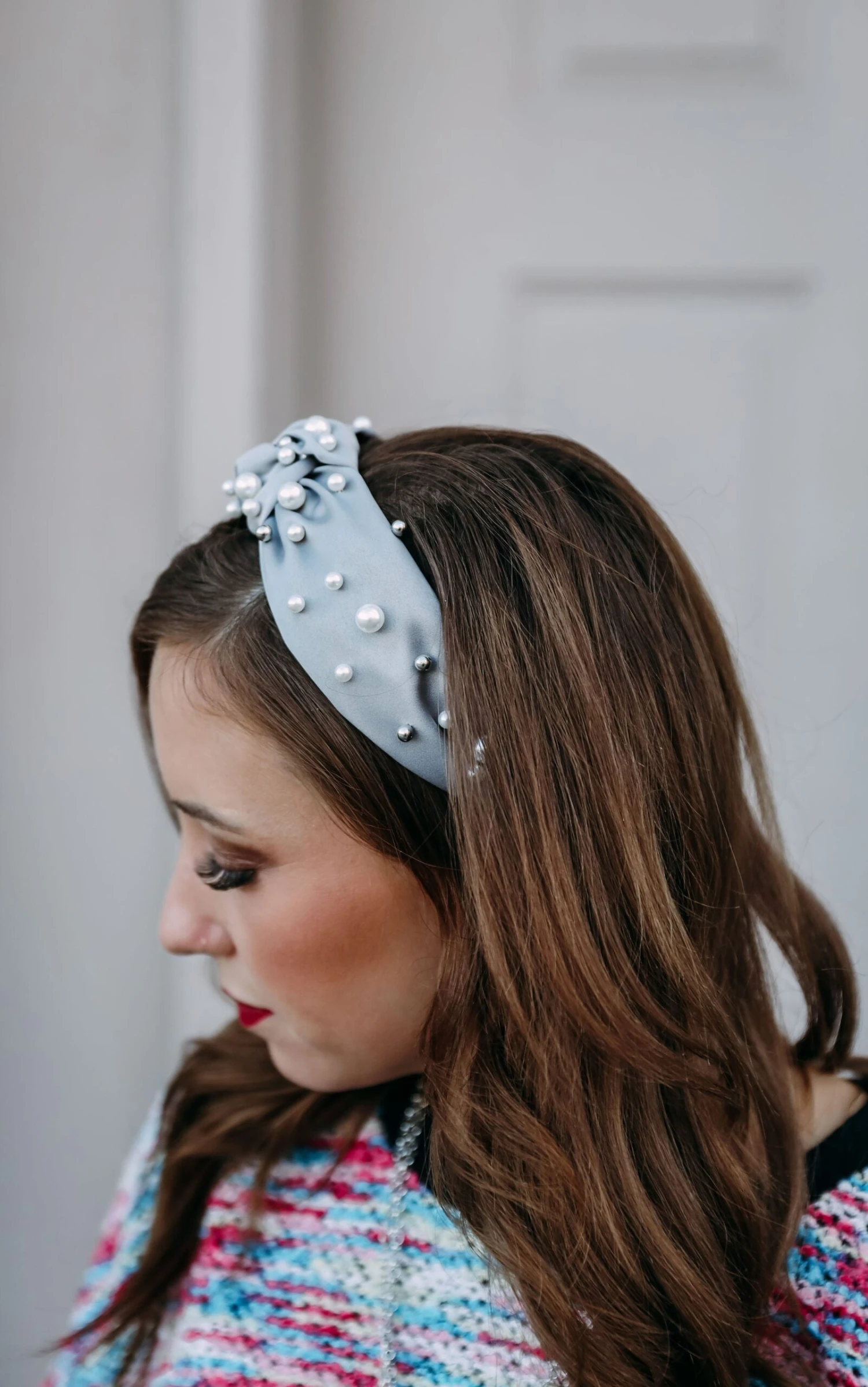 Headband measures 15″ from end to end 2″W at widest part, Knot is 1.75″ wide Houndstooth Print with Pearl Details Padded Ends for Ear Cushion