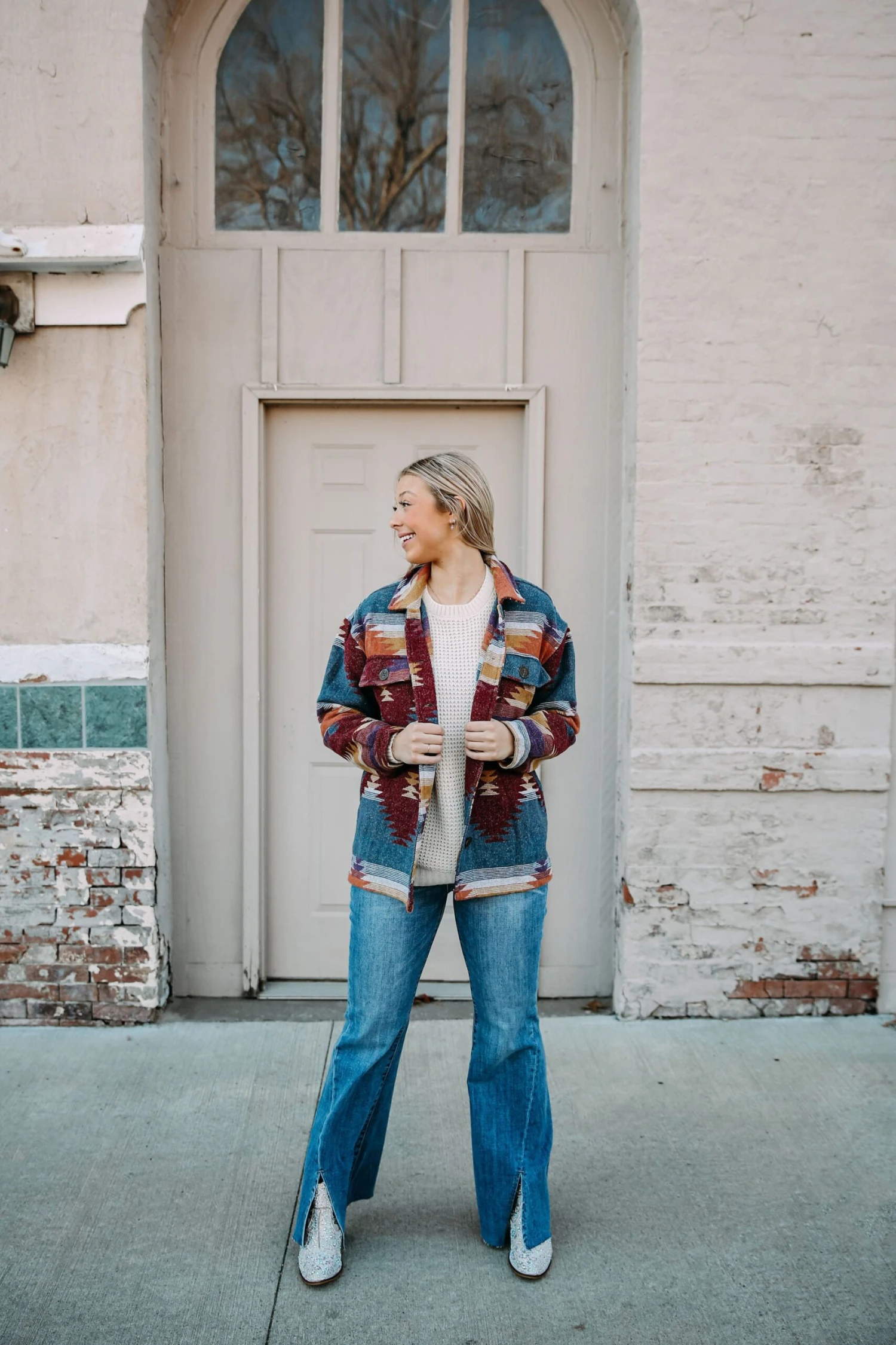 Aztec print collared jacket with chest pockets and long buttoned sleeves. - Button up, non-sheer, heavy weight.