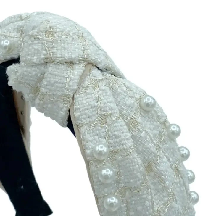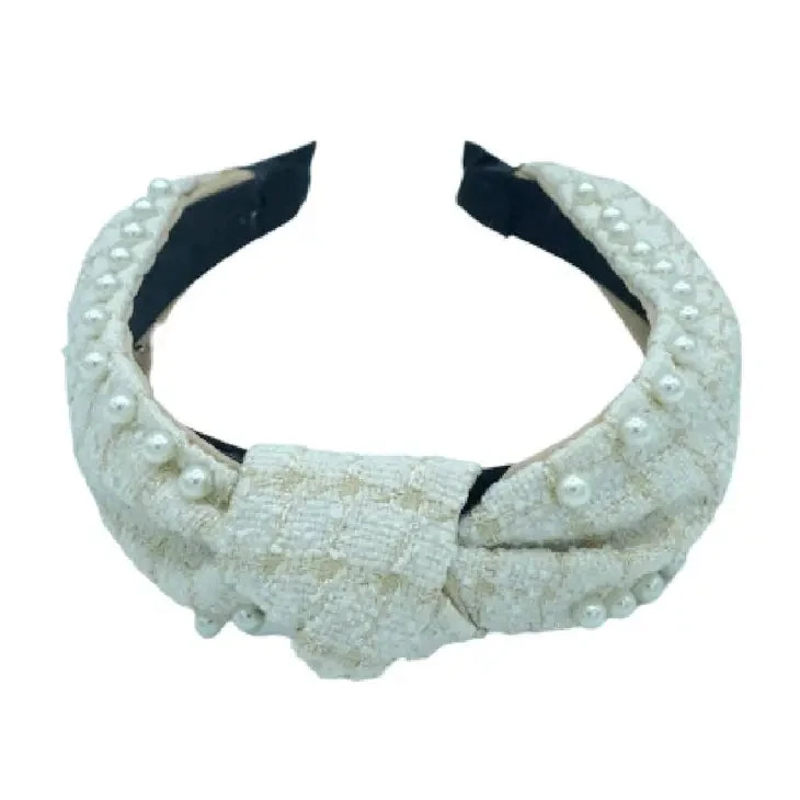 Headband measures 15″ from end to end 2″W at widest part, Knot is 1.75″ wide Houndstooth Print with Pearl Details Padded Ends for Ear Cushion Available in 2 colors