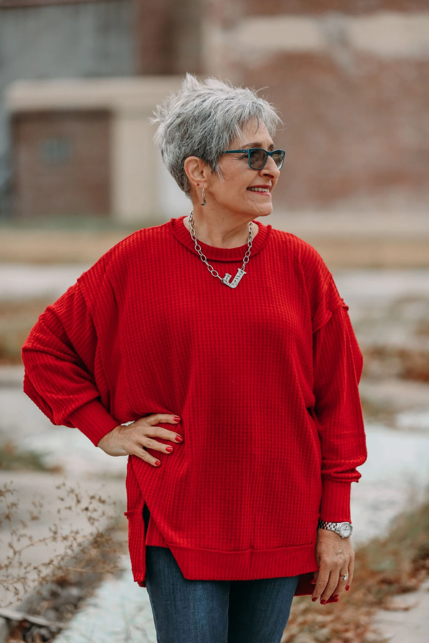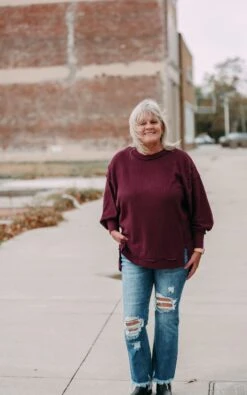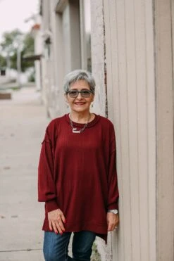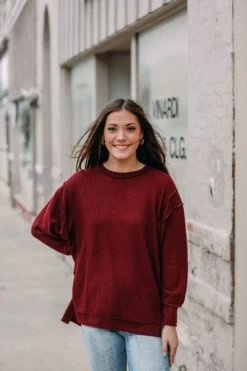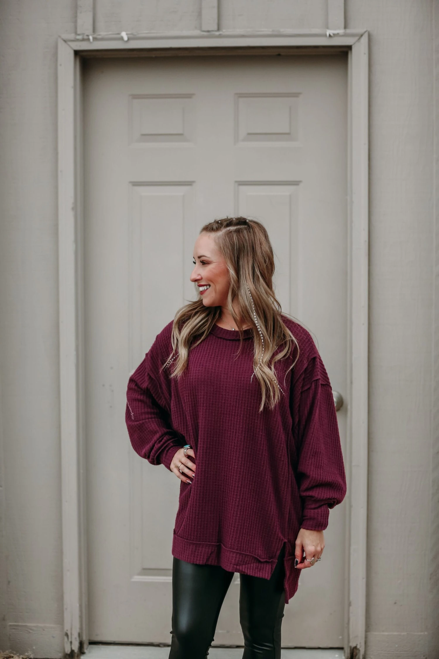 BRUSHED WAFFLE OVERSIZED EXPOSED-SEAM SWEATER WITH SIDE SLITS – EXPOSED SEAM DETAILS – HI-LOW HEM