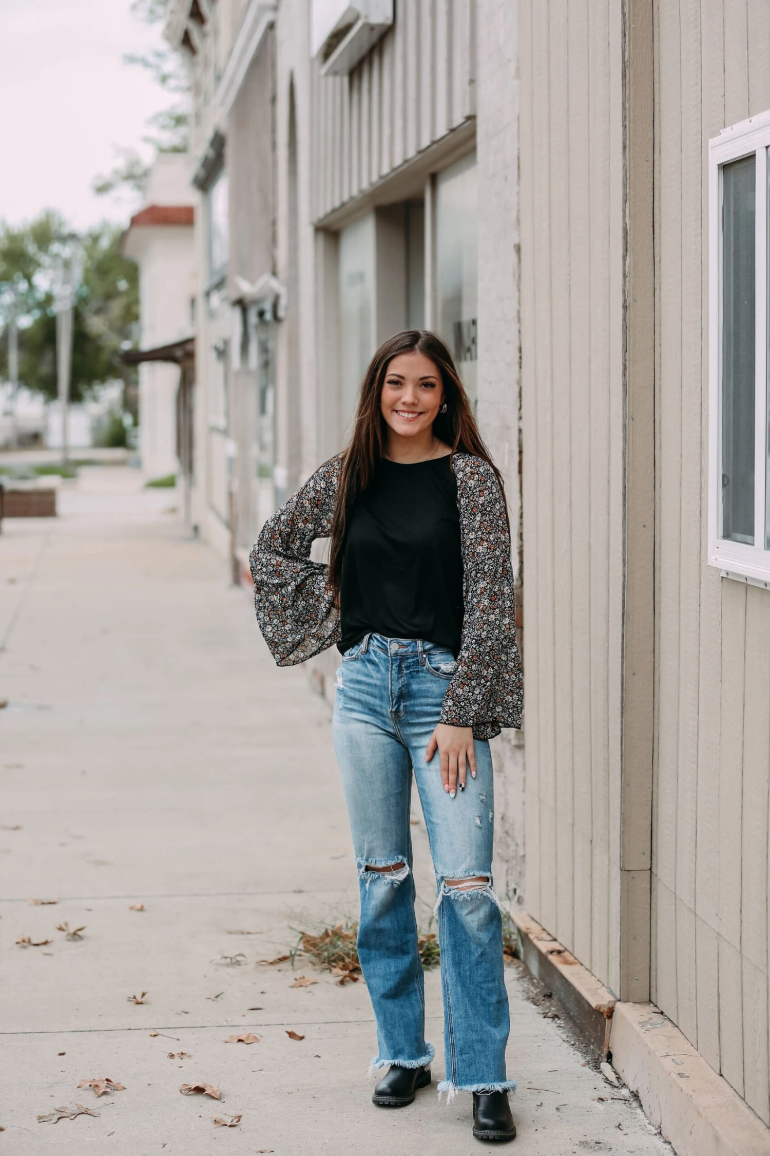 A high wasted jean with distressing and a straight leg fit makes for a trendy look!
