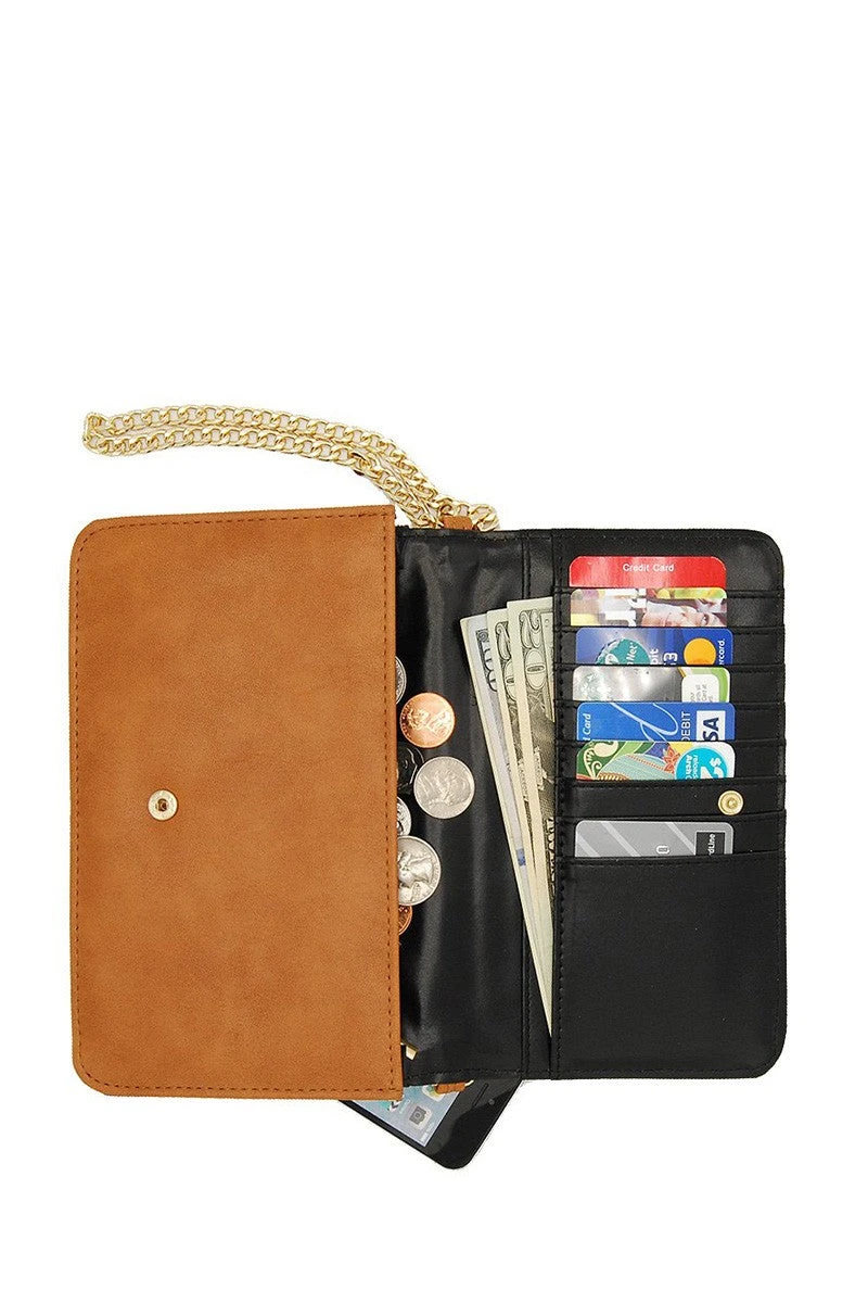 Smooth faux leather matching trim Solid faille lining Gold plated hardware Wallet with fold close 8 card slots and zip pocket 7.5"L x 5"W x 2"H