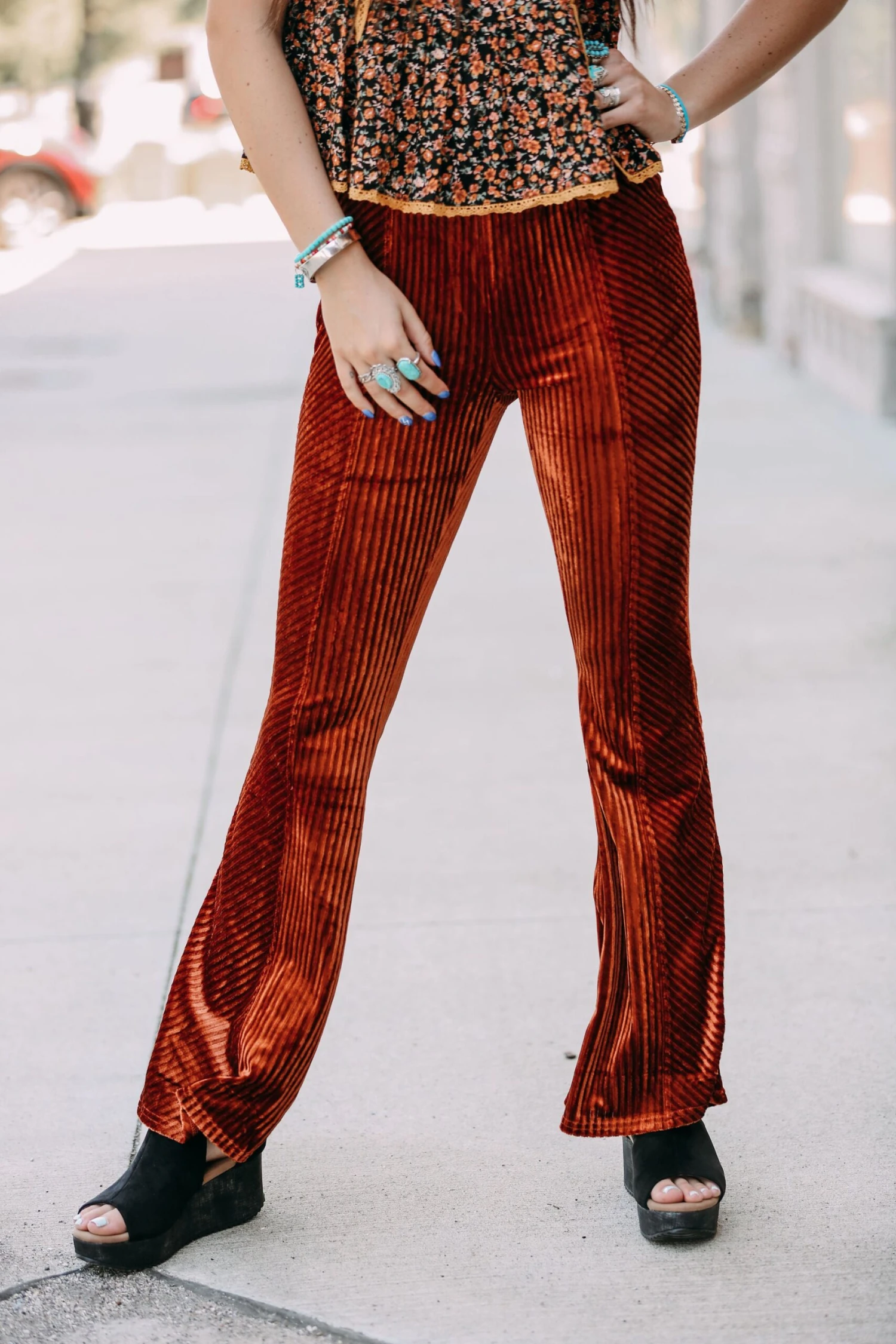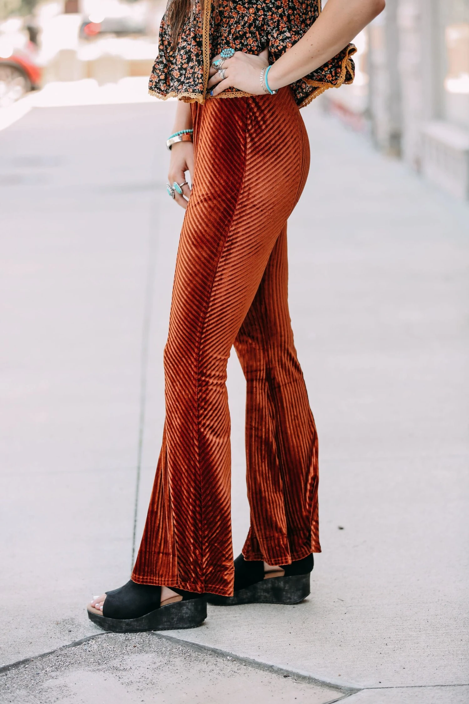 The cutest velvet bell bottoms that are oh so comfy and trendy these will be perfect for all things graphic tees and a shacket or dress them up and pair them with a booty!