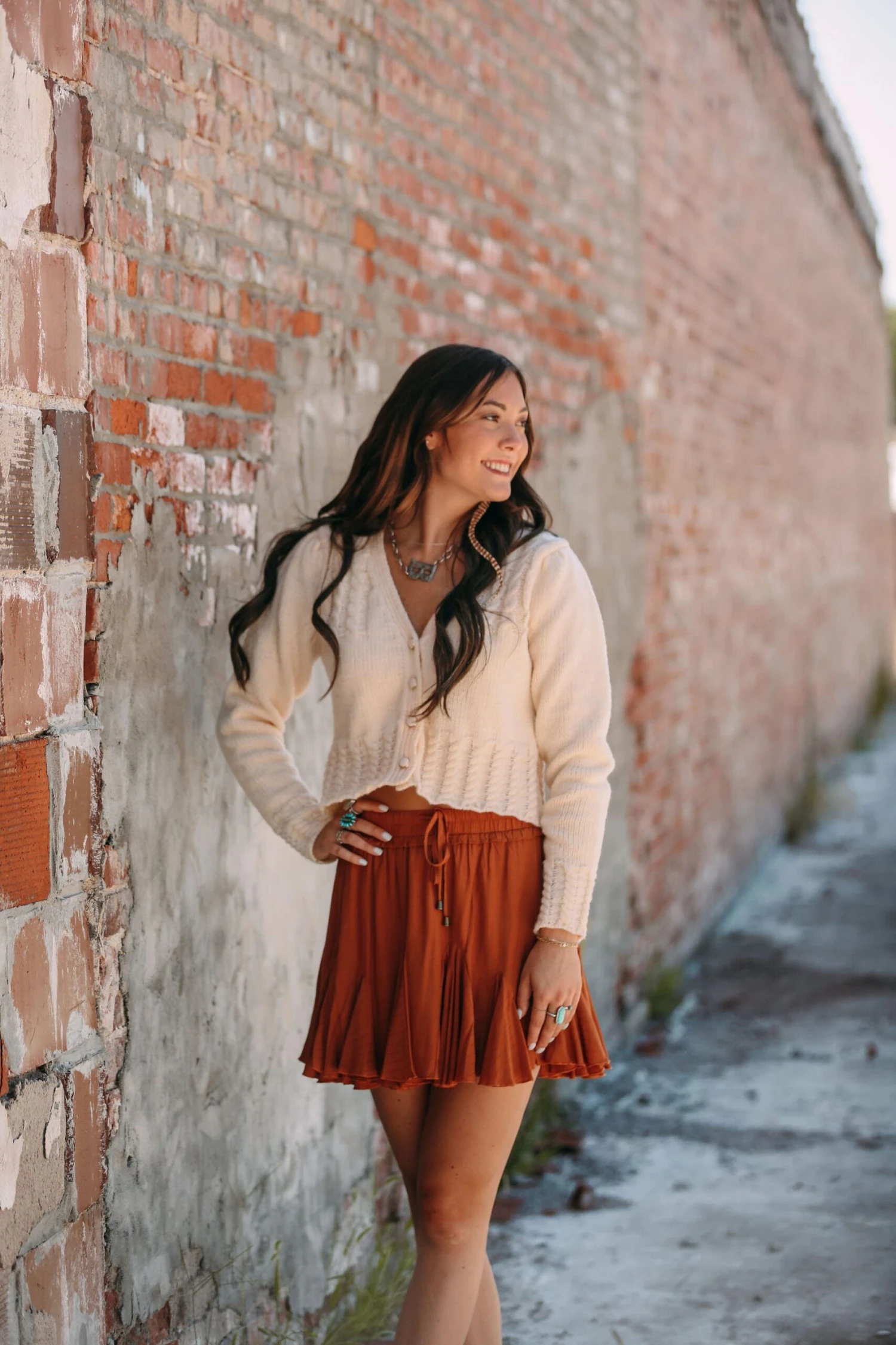 This tan midi ruffle skirt will be super cute to take with you into fall! You could pair it with a black sweater, a cute pair of booties, and some gold jewelry for the perfect fall outfit. It has strings to make a tie in the front!