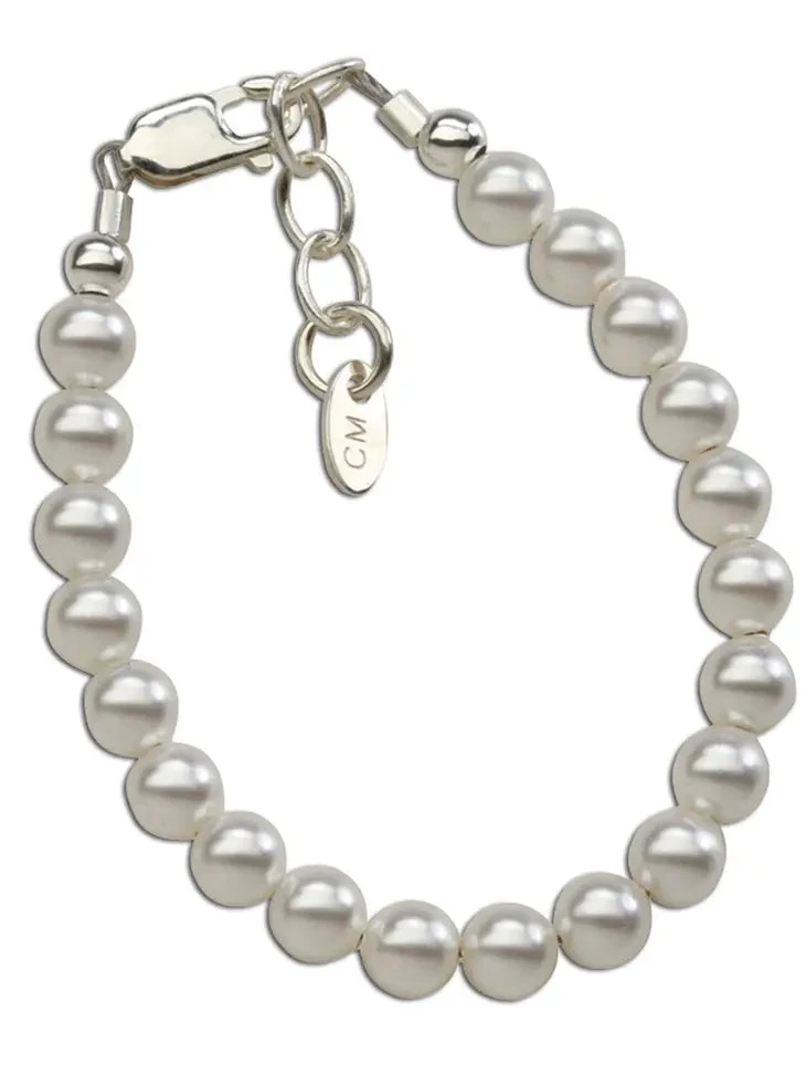 Beautiful sterling silver bracelet featuring a strand of light pink high-end simulated pearls – simple and classic! This looks beautiful for flower girls or Jr. Bridesmaid and is a timeless keepsake that makes a perfect baby gift, flower girl gift, or her first pearls! Each bracelet has an extension chain, so as the child grows you just move to the next link for a perfect fit. This bracelet is available in three sizes and is great for infants, babies, toddlers, and kids.