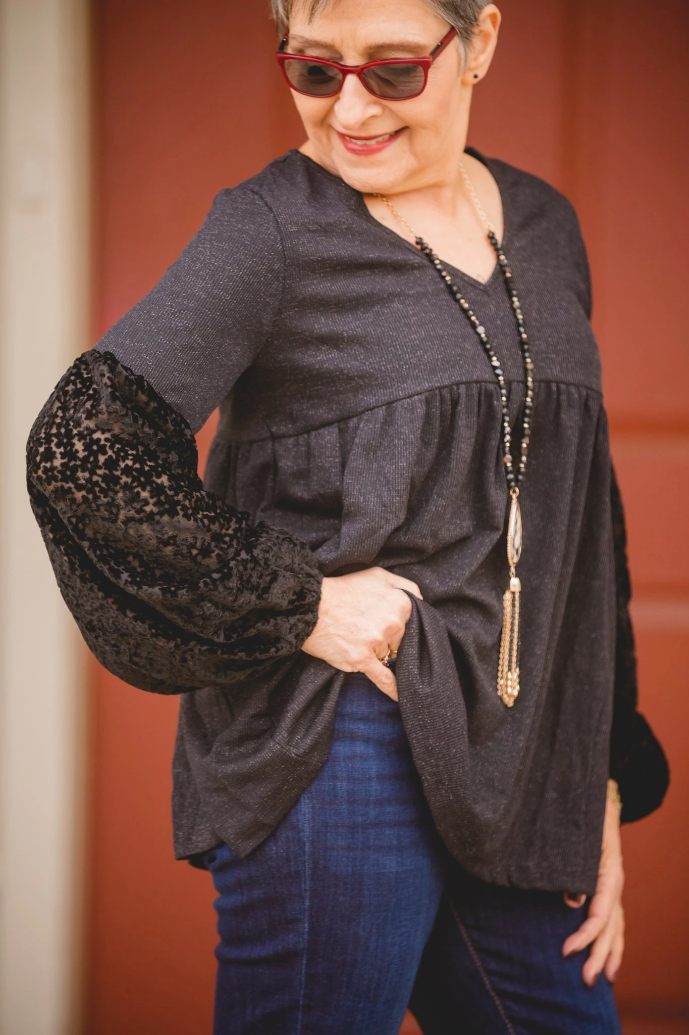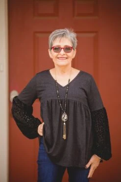 This blouse is a dream. The long sleeve top is perfect for wear to work, holidays, or just plain old dressing up your favorite pair of jeans! The lace on the sleeves make it great for holiday parties or Christmas!