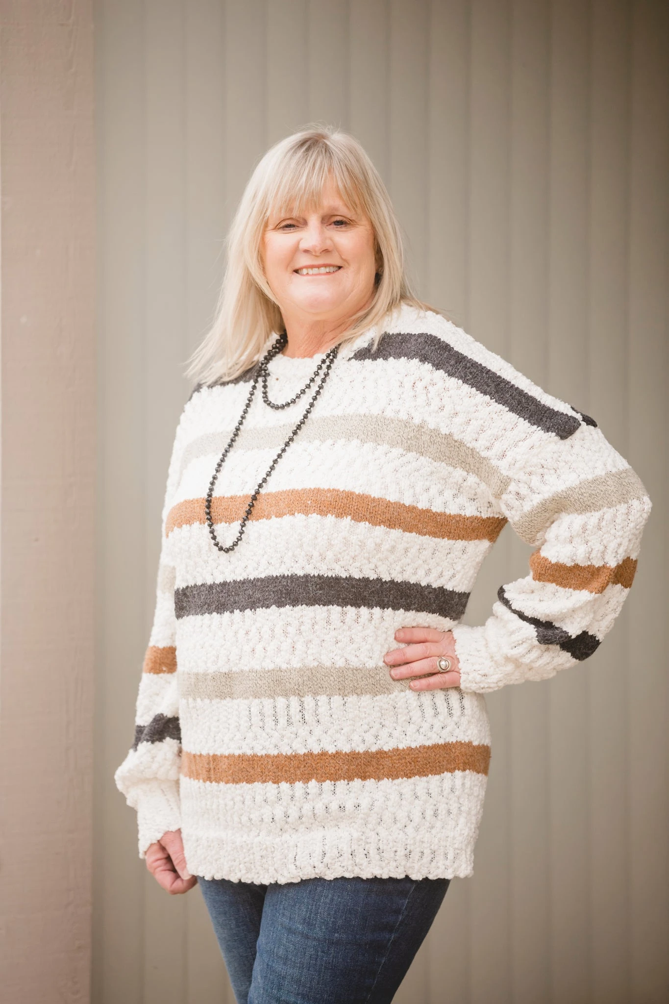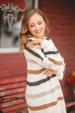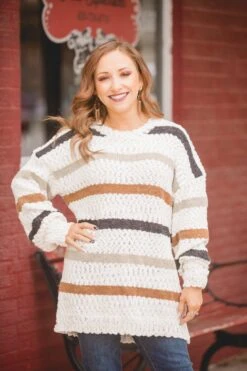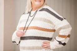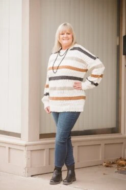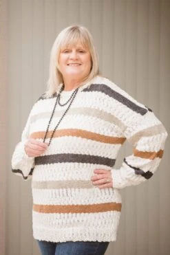 True to Size Tunic Length - ROUND NECKLINE - LONG LENGTH - POPCORN SWEATER - MULTI STRIPED - MIXED YARN SWEATER