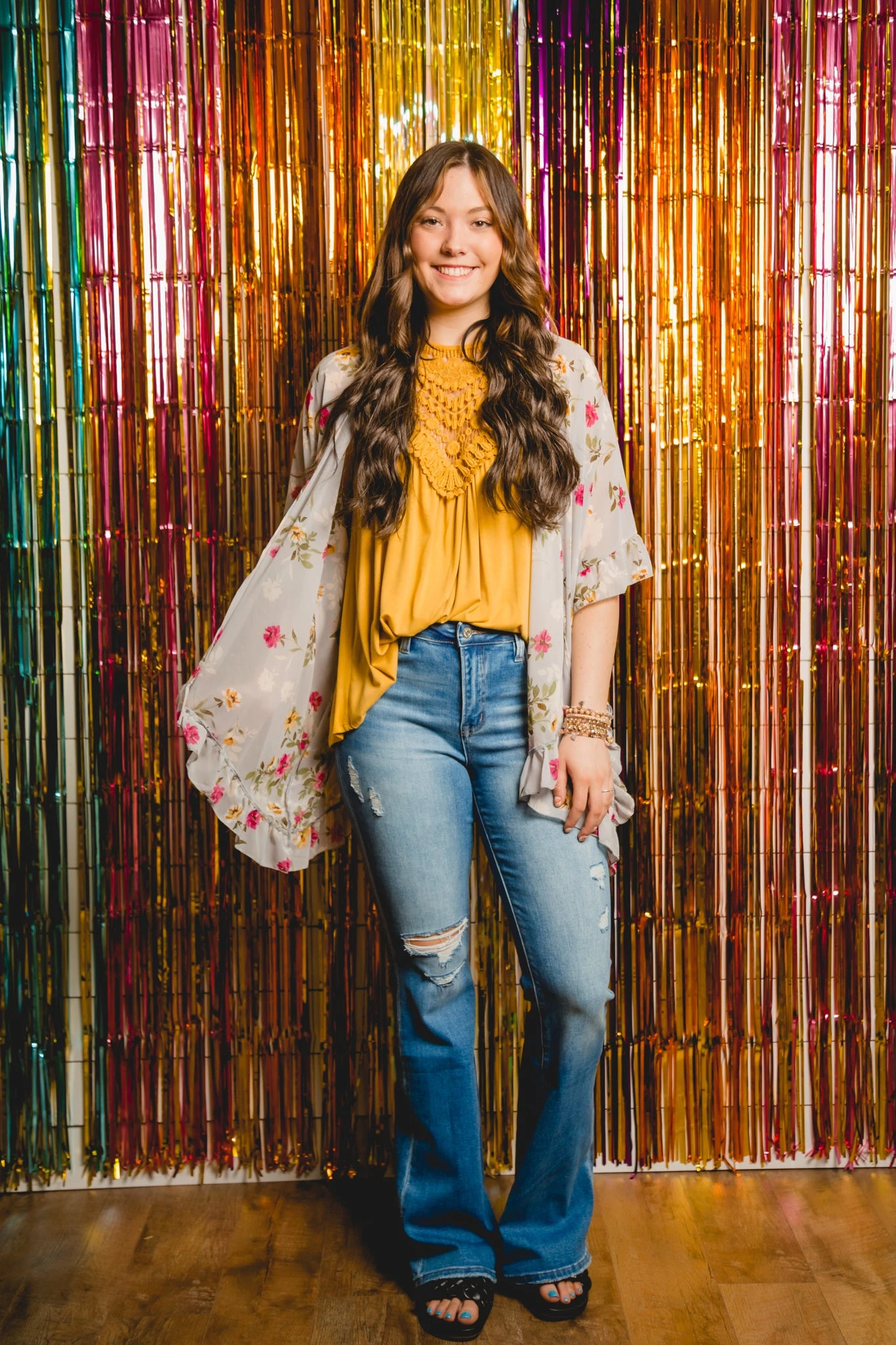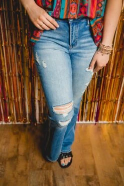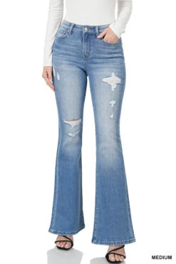 HIGH-RISE DISTRESSED FLARE DENIM PANTS – GOOD STRETCH DENIM FRONT RISE: 10.25″, INSEAM: 33.5″ approx. LEG OPENING: 22.25″ approx. * MODEL IS 5’9″ WEARING SIZE 27 ** COLOR MAY VARY SLIGHTLY DUE TO MONITOR RESOLUTION